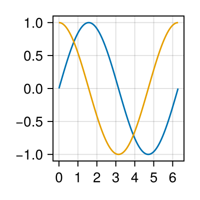 lines!(ax, x, y2; label="cos(x)")