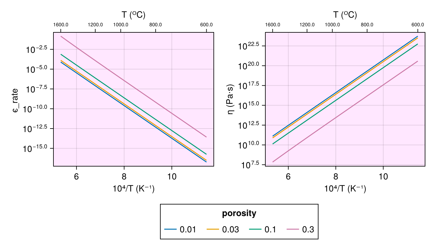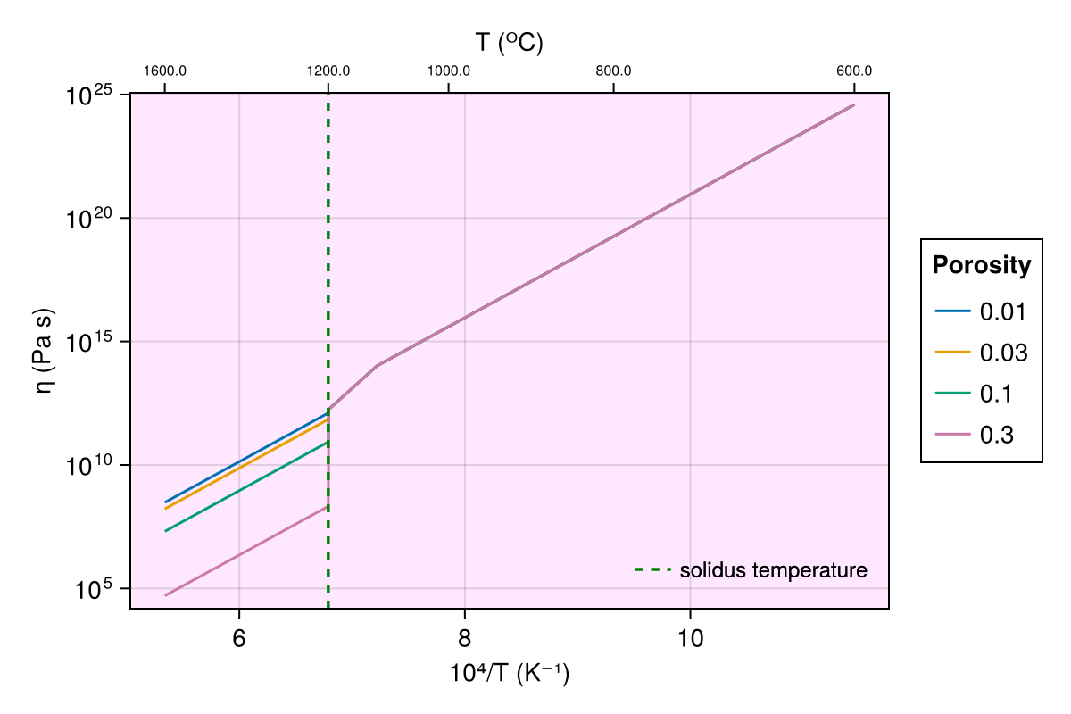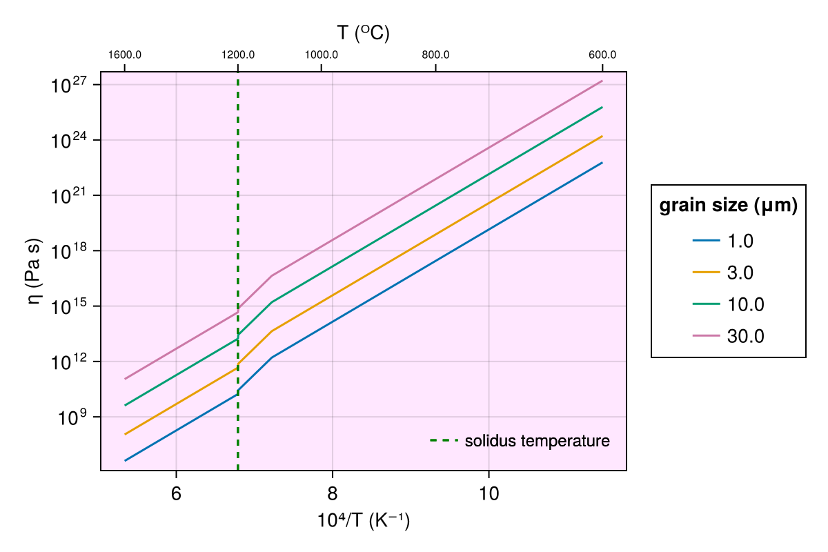 xfit_premelt(T, P, dg, σ, ϕ)Calculate viscosity for steady state olivine flow for pre-melting, i.e., temperatures are just below and above the solidus, per Yamauchi and Takei (2016)