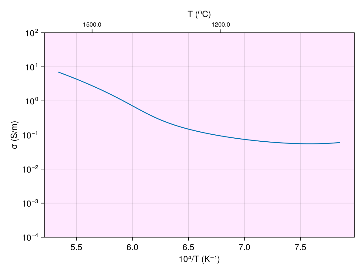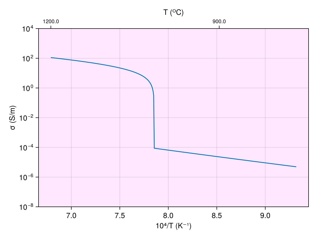 ax = Axis(f[1, 1]; yscale=log10, xlabel="10⁴/T (K⁻¹)", ylabel="σ (S/m)",