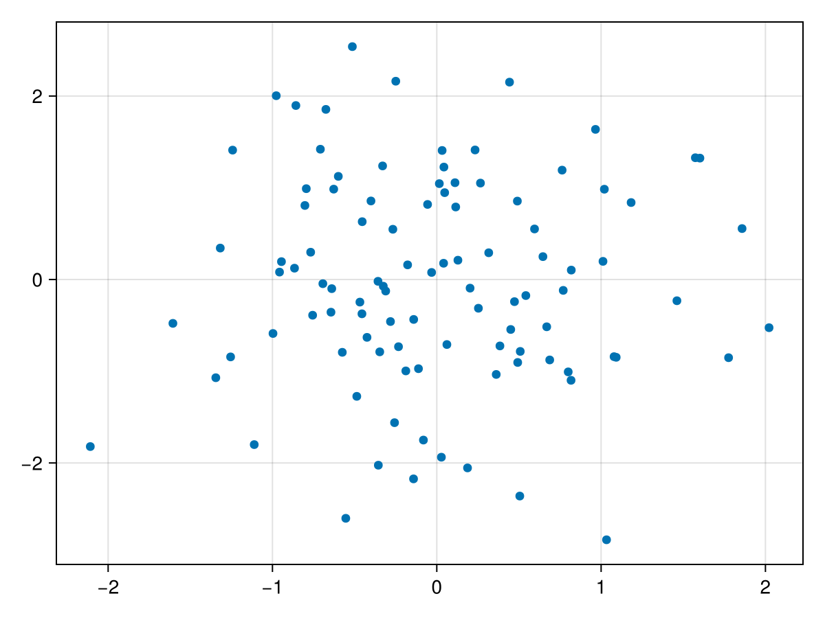 Makie.jl works around three objects : scene, figure and axis. Of these three, scene is mostly useful for 3D rendering, which, while is a nice feature, is not really useful for us. We, therefore, make use of the latter two.