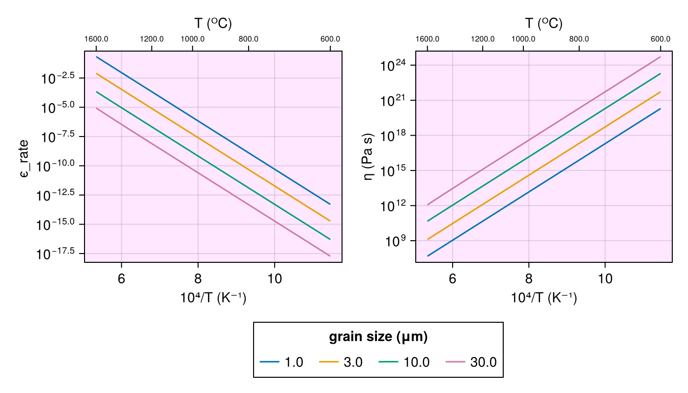 Note that `xfit_premelt` populates the return value of strain rate with zeros. We, therefore, do not plot the same here.Varying grain size