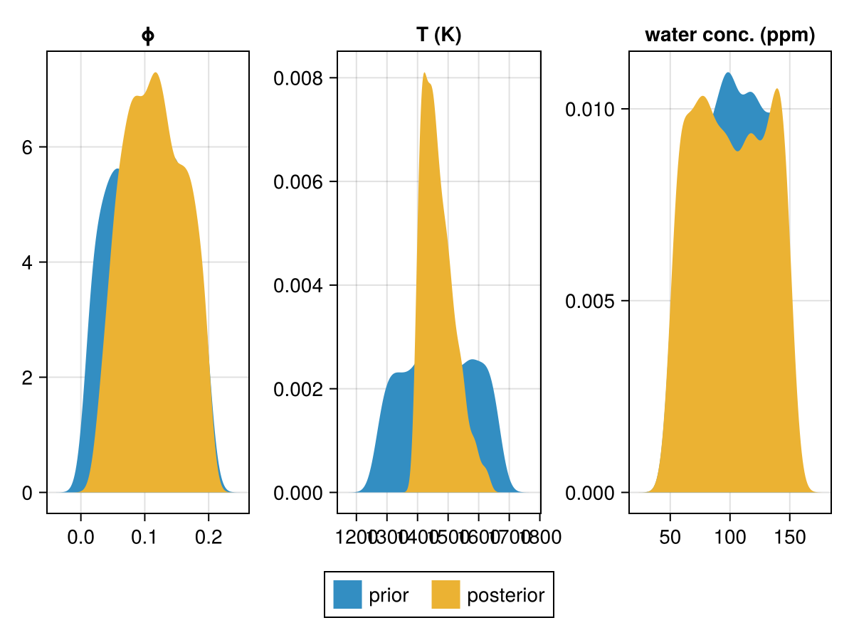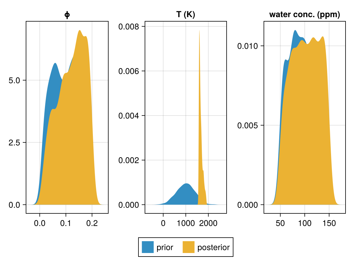 Lets try to also infer the water content along with the temperature. Everything remains the same, except that now, in ps_nt, the vector corresponding to water content Ch2o_ol will be replaced by a corresponding distribution.