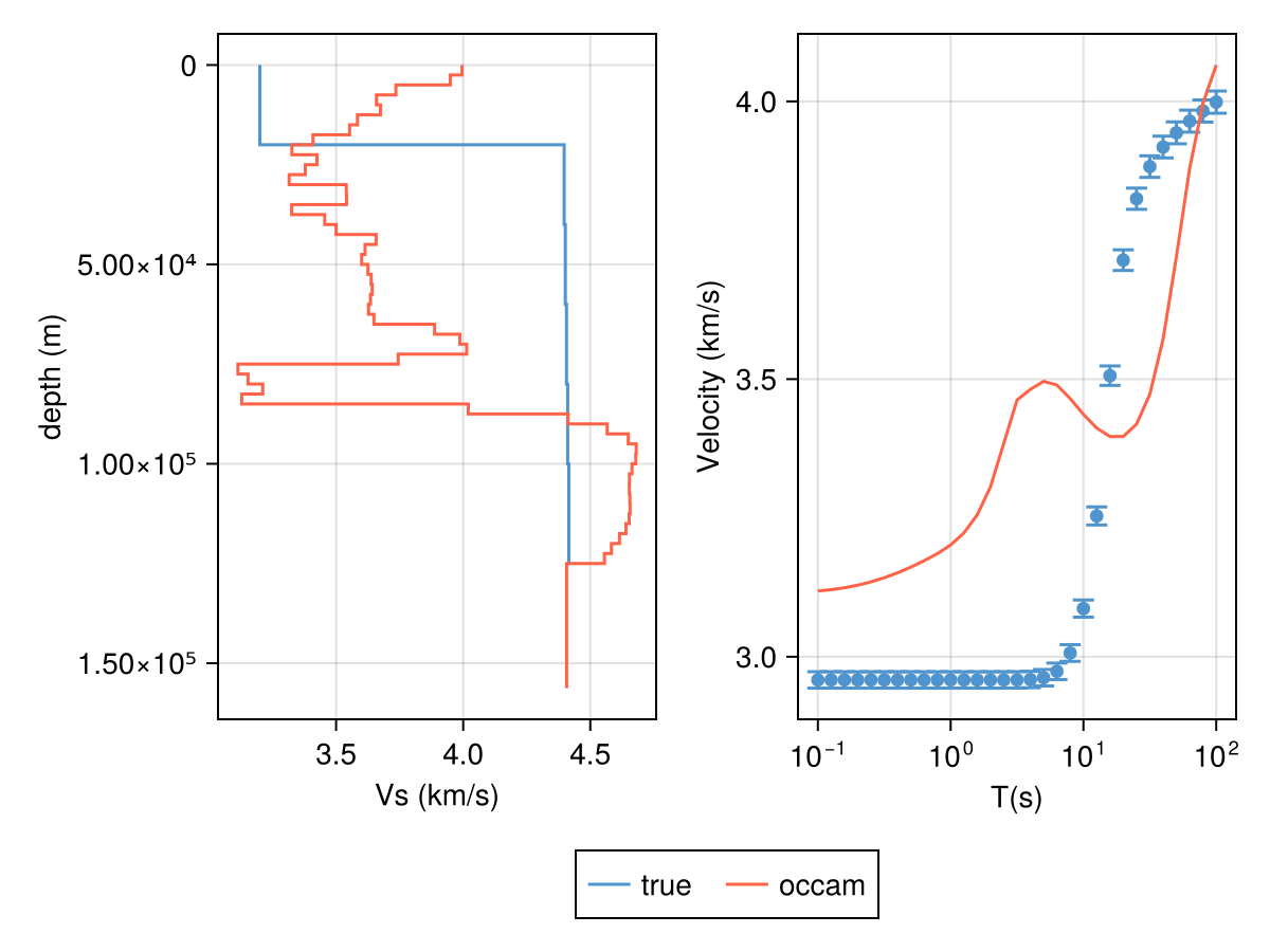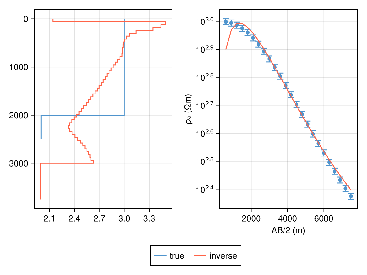 C_d = diagm(inv.(err_resp.c)) .^ 2The final result will be stored in the same variable m_occam. All we need to do now is specify using Occam and then calling inverse!.