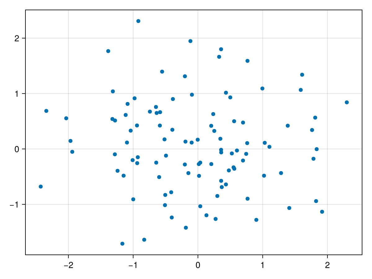 Makie.jl works around three objects : scene, figure and axis. Of these three, scene is mostly useful for 3D rendering, which, while is a nice feature, is not really useful for us. We, therefore, make use of the latter two.