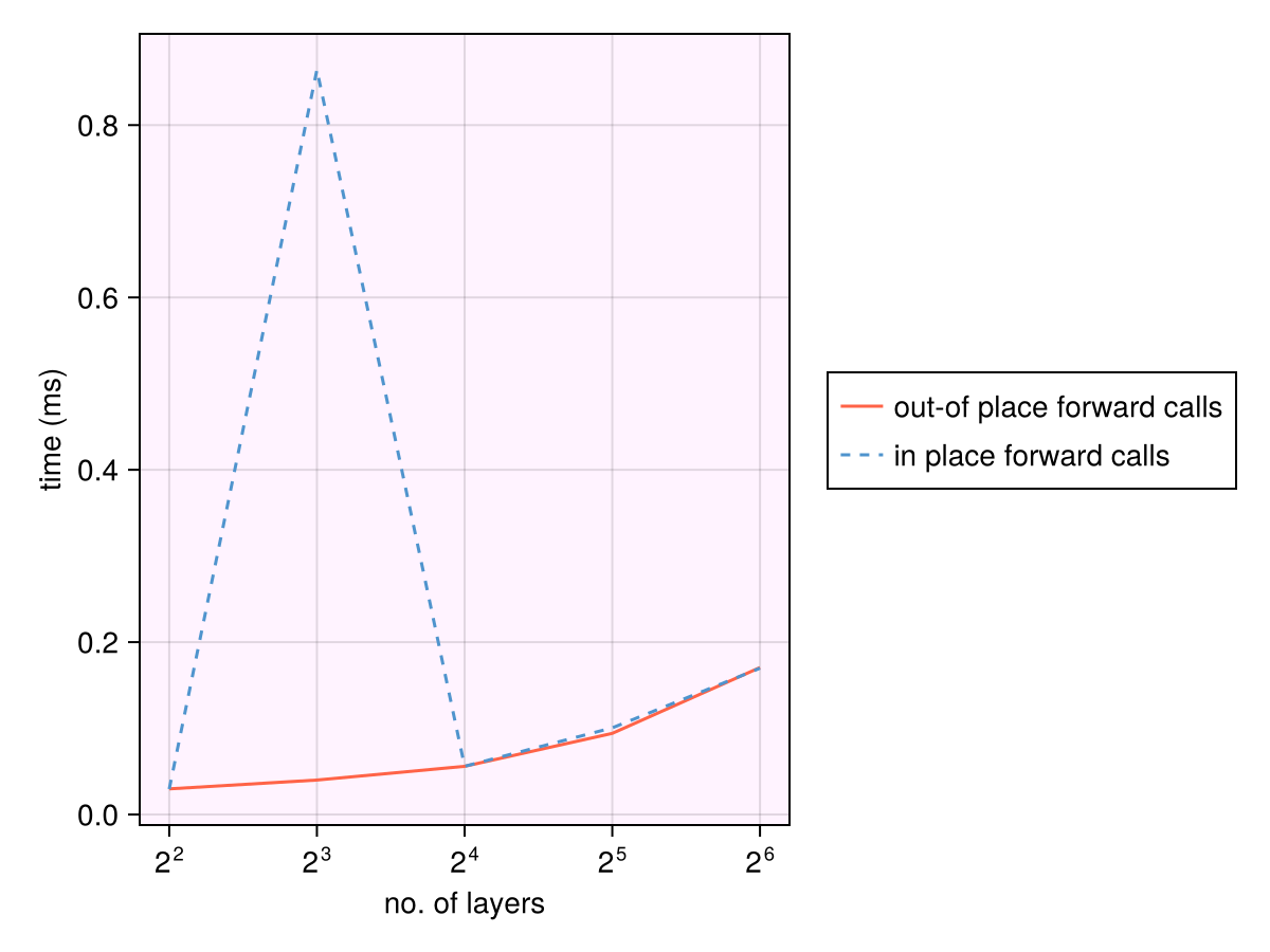 lines!(n_layers, btime_oop .* 1e3; label="out-of place forward calls", color=:tomato)