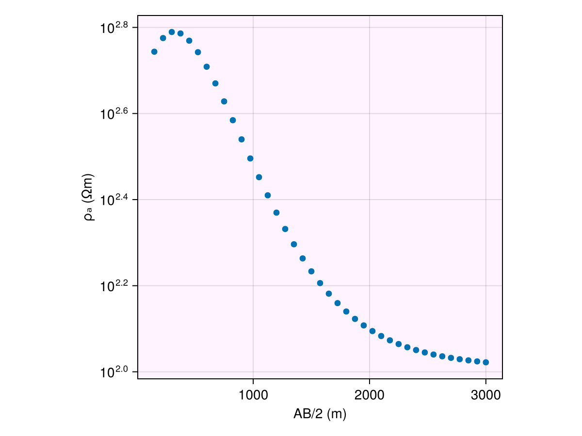 locs = get_wenner_array(100:50:2000)(recs = [-50.0 50.0; -75.0 75.0; … ; -975.0 975.0; -1000.0 1000.0], srcs = Float32[-150.0 150.0; -225.0 225.0; … ; -2925.0 2925.0; -3000.0 3000.0])and then call the forward dispatch as usual to get MTResponse: