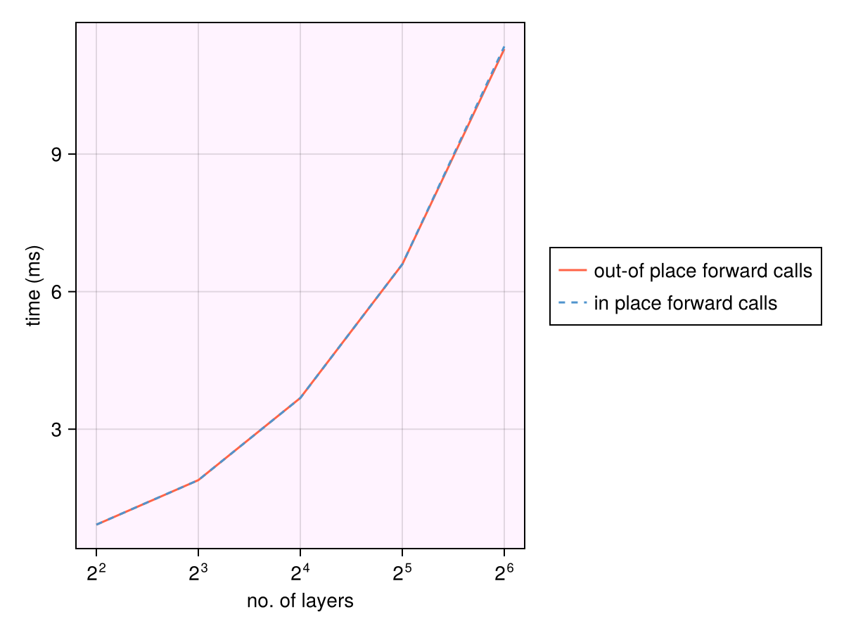 lines!(n_layers, btime_oop .* 1e3; label="out-of place forward calls", color=:tomato)