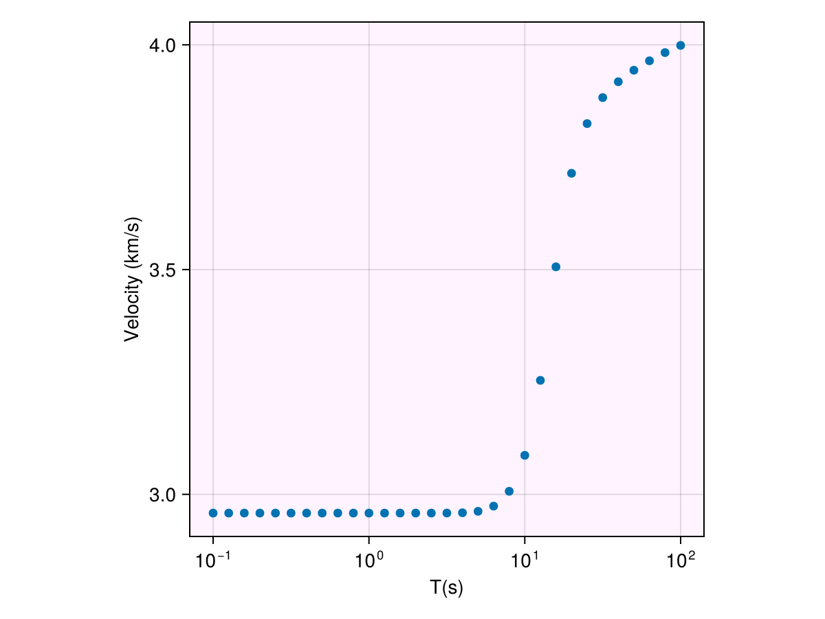 mode: fundamental mode corresponds to 0, higher modes correspond to 1,2,...dc: step size used to obtain solution of the propagater matrixdt: step size used to obtain the derivative for group velocity, unused for phase velocityVal(:phase): to calculate phase velocity, passVal(:group)to calculate group velocity