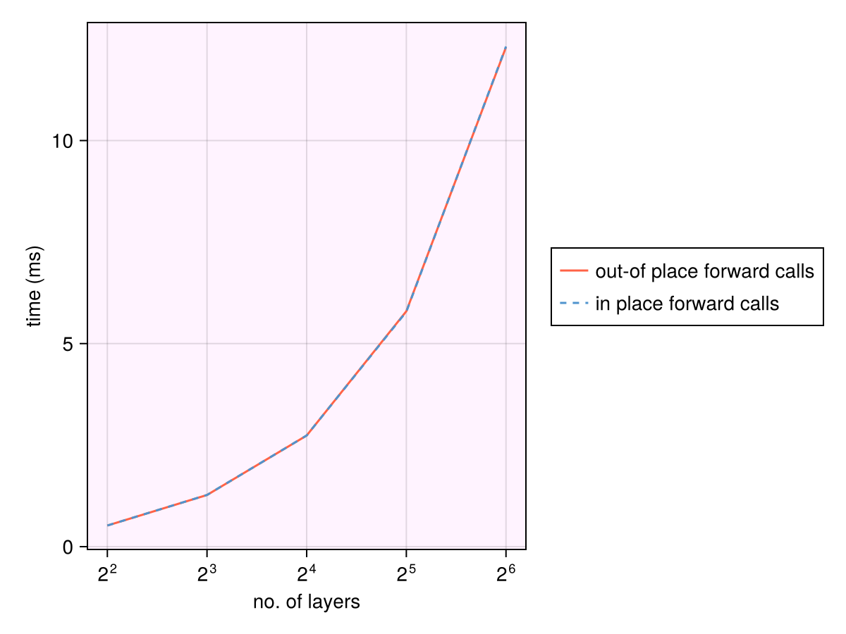 lines!(n_layers, btime_oop .* 1e3; label="out-of place forward calls", color=:tomato)