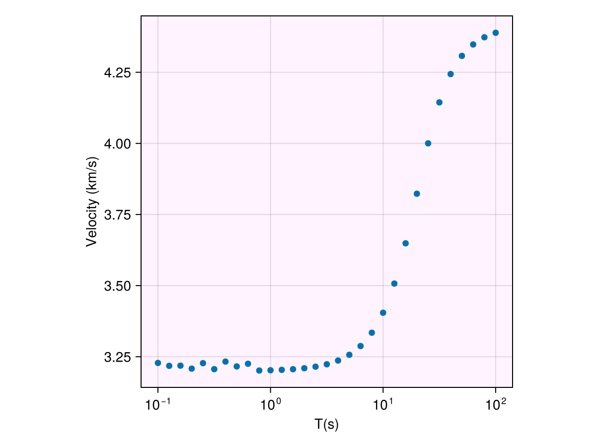 mode: fundamental mode corresponds to 0, higher modes correspond to 1,2,...dc: step size used to obtain solution of the propagater matrixdt: step size used to obtain the derivative for group velocity, unused for phase velocityVal(:phase): to calculate phase velocity, passVal(:group)to calculate group velocity