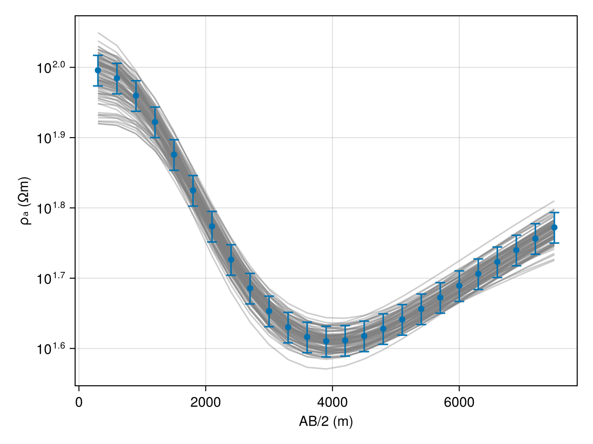 In the following example, we demonstrate MCMC inversion for a 3-layered earth, including the half-space being imaged using DC resistivity method. The prior distribution assumes all layers have uncorrelated resistivities bounded between